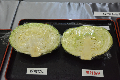 LED照射の比較結果。照射した右の方が中央部の緑化が進んでいる
