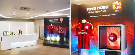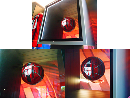 東洋ゴム工業は、イリュージョン・ディスプレイ「Flyvision」を用いて宙に浮いて見えるACミランのサインボールを、本社受付ロビーで公開した。