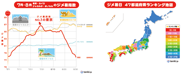 日本気象協会が運営する天気予報専門サイト「tenki.jp」は、過ごしづらい暑さを表す指標を「ジメ暑(じめあつ)指数」と定義し、「2015年 日本の“ジメ暑傾向”」を公開した。
