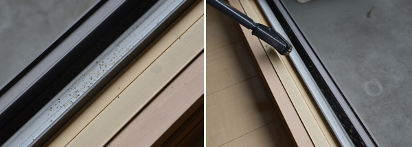一方、「2WAYロングノズル」は、家具の裏など、手の届きにくい狭い場所の掃除に有効で、サッシで使ってみると、レールにたまった砂を先端のブラシでかき集めた上でベランダに吹き飛ばすことができた。