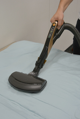 「風神 TC-ZXF30P」は、ふとん専用の「アレルパンチふとんクリーンブラシ」も新たに付属する。走行車輪とブラシが互いに逆回転するので、シーツなどを吸い込むことなく、片手で簡単に掃除できた。