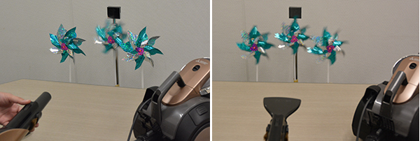 風車を使ったエアブロー機能の比較。従来のノズル(左)と