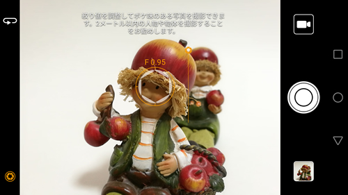 クリエイティブな絵作りをするために有効なのが背景ぼけの積極的な活用。絞り値(F値)を小さくすれば、より背景をぼかすことができる。「HUAWEI P9」のカメラアプリのメイン画面には「絞り値」を調整するためのアイコンが表示されており、メインの被写体にピントを合わせたままで、F0.95~F16の間で調整可能だ。