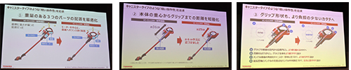 「VC-CL1300」が目指したのは、キャニスタータイプのような「軽い操作性」だ。重さは従来機種と変わらないが、吸引モーターや電池といった部品の配置を変えてバランスをよくしたり、本体の重心からグリップの距離を短くしたりして、持ち上げる際の荷重を従来機種に比べて約3割軽減した。
