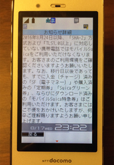 「モバイルSuica」を提供するJR東日本は、8月24日以降、SHA-2方式/TLS1.0以上に対応していない携帯情報端末では「モバイルSuica」を利用できなくなると案内し、利用者に対し、個別にメールで通知している。なお、新規チャージや新規の定期券の購入などはできなくなるが、チャージ済みの電子マネー、8月24日以前に購入した「定期券」「Suicaグリーン券」、ダウンロード済みの「モバイルSuica特急券」は、引き続き利用できる。