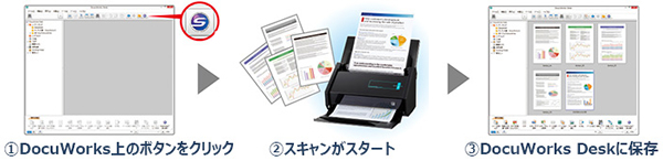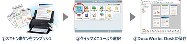 「ScanSnap」でスキャンした書類のデータを、自動的にDocuWorks文書に変換し、「DocuWorks」のフォルダ「DocuWorks Desk」へダイレクトに保存する。これによってスキャンデータの迅速な活用が可能になる。