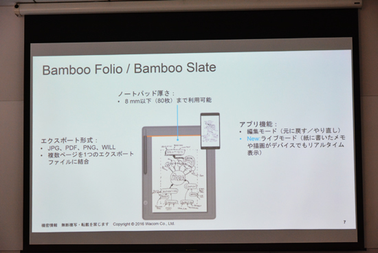 どちらも、パッドに設置できる紙の厚さを従来機種の5ミリ以下から8ミリ以下に拡大し、エクスポート形式で新たにPNGを選べるようになったほか、アプリの機能に、書いたメモをリアルタイムに表示するライブモードを追加した。