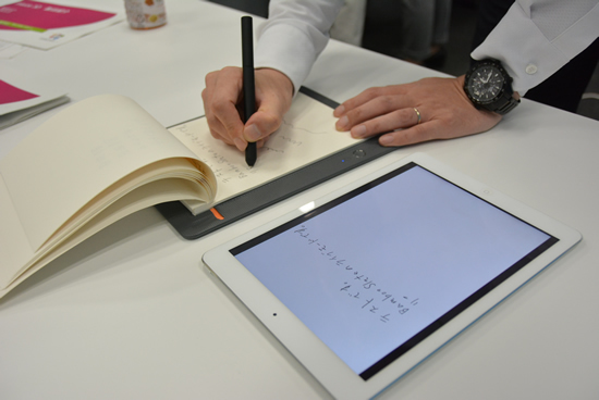 従来機種からの仕様変更では、側面にあって分かりにくかった電源ボタンをなくし、本体のマルチファンクションボタン1つで簡単に操作できるようにした。スマートペンは、材質をアルミからマット仕上げに変え、なくしやすいキャップを廃止。持ちやすいように、形状も丸型から三角型にした。対応機種は、iOS/Android搭載した端末。バッテリの駆動時間は8時間。