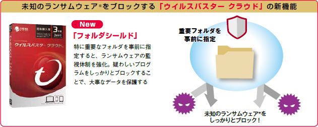 2016年上半期NO.1に輝いたトレンドマイクロは、最新の脅威への対応が強みであるが、ランサムウェアに対しても例外ではない。他社も力をいれるランサムウェア対策だが、トレンドマイクロは既知のウイルスはもちろん、未知のウイルス(※)にも対抗する独自機能を搭載している。ランサムウェアの脅威は下半期も予想される。早めの対策で取り返しのつかない事態を防ぎたい。<新製品>ウイルスバスター クラウド
