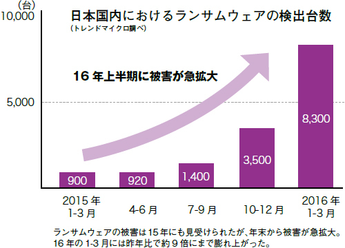 16年上半期に一気に流行した新種のウイルス「ランサムウェア」。感染した端末にロックかけたり、ファイルを暗号化して使用できなくしたりするウイルスで、元に戻すのと引き換えに金銭を要求することから“身代金要求型ウイルス”とも呼ばれている。