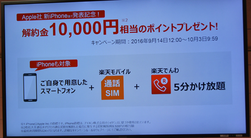 楽天は9月14日、MVNOサービスの「楽天モバイル」で、SIMカードのみの契約者向けに「Apple社 新iPhone発表記念 10,000ポイントプレゼントキャンペーン」と端末保証サービス「つながる端末保証 by 楽天モバイル」を開始した。