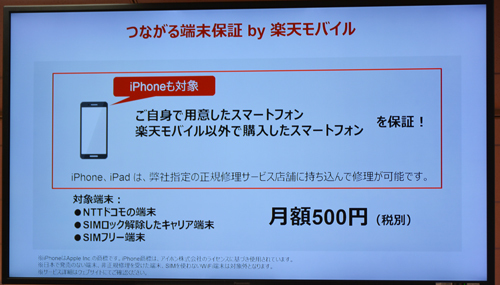 「つながる端末保証 by 楽天モバイル」は、月額税別500円で加入でき、楽天モバイル以外で購入したスマートフォン・タブレット端末・モバイルルーター1台を対象に、故障時の修理サービスや代替機の提供を年2回まで受けられる。