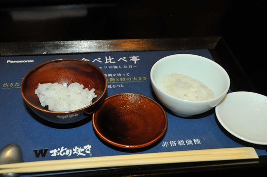 「食べ比べ亭」では、6月に発売した最上位モデル「Wおどり炊き SR-SPX6シリーズ」で炊いたごはんと、2011年モデルで「Wおどり炊き」非搭載の「SR-SX101」で炊いたごはんを比較できる。