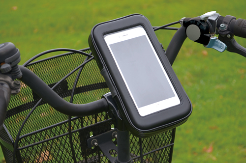 スマホやモバイルバッテリを水滴やホコリから守る防滴・防じんに対応。自転車には、工具を使わず、付属の自転車取り付け具を使って簡単に装着できる。