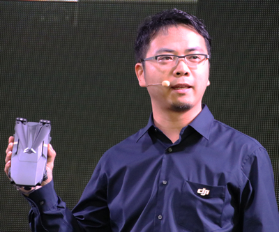 折りたたんである「Mavic Pro」を持ちながらプレゼンを行う呉稲代表取締役
