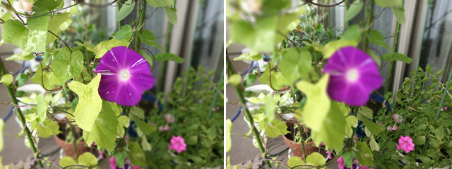 まるで違う写真に仕上がる(左:手前中央の朝顔にピントを合わせる、右:手前のペチュニアにピントを合わせる)