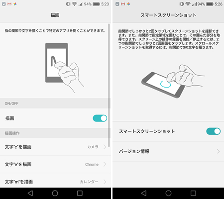 ナックルジェスチャーとして、「描画」(左)と「スマートスクリーンショット」