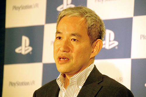PSVRは、家庭用ゲーム機「PlayStation 4」と接続することでVRが体験できるヘッドマウントディスプレイ。SIEジャパンアジアの盛田厚プレジデントは、初めのあいさつで「家庭内での映像体験としては、テレビの登場以来の衝撃。今まではテレビの前で画面を眺めていたが、これからはテレビの中に入り込める。家に居ながら旅行やライブなど、どこにでも行けるし、何にでもなれる」と語った。