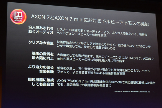 「AXON 7」は、ZTEが展開するスマホの最上位機種で、中国の西安音楽学院と協力した音響システム「Pure Sound 1.0」が最大の特徴だ。パワフルなデュアルスピーカーに加え、旭化成エレクトロニクス製の高級オーディオ専用チップを備え、雑味・歪みといった濁りをなくした高音質のHi-Fiサウンドを実現した。ハイレゾ対応のヘッドホンを使用すれば、ハイレゾ音源の再生にも対応する。さらに、「AXON 7」「AXON 7 mini」とも、映画館やホームシアターなどに導入されている立体音響技術「ドルビーアトモス」を日本のスマホで初めて実装した。