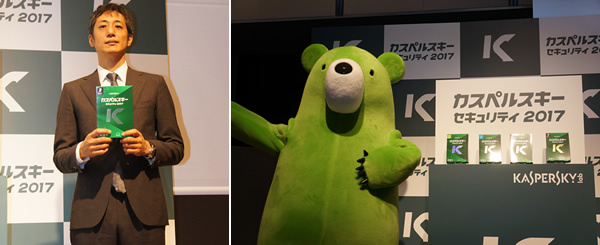 「カスペルスキー セキュリティ 2017」の発表会には、川井林太郎代表取締役社長(左)や、同社のマスコット・グリーンベアが登場した
