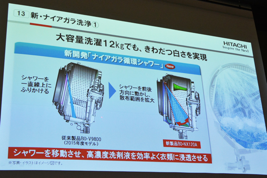 一方、従来機種でも備える乾燥機能「風アイロン」は、新しい湿度コントロールで乾燥の効率を向上。「ナイアガラ洗浄」は、シャワーを前後に稼働させることで、より広範囲に洗浄液を散布できるようになった。