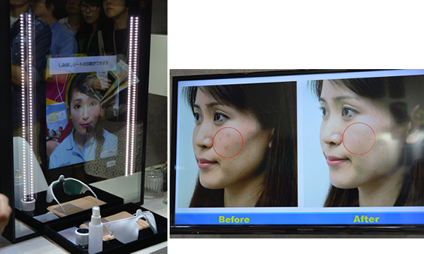まず、ユーザーは、ハーフミラーの向こう側にカメラを設置した鏡台の前に座り、カメラで肌の光の反射度合いなどからシミや毛穴の位置、濃さを検知する。