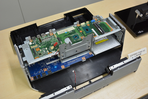 機能だけでなく、使いやすさも追求した。通常のPCで1枚の基板の数を2枚に増やし、スピーカーを挟み込むような形で上下に設置。これにより、前面では、電源ボタンやヘッドホン端子、USB3.0ポート、SDカードスロットなどを前面に置くフロントアクセスインターフェースを実現し、背面では、本体の天板を開けるだけで簡単にメモリ交換などをできるようにした。