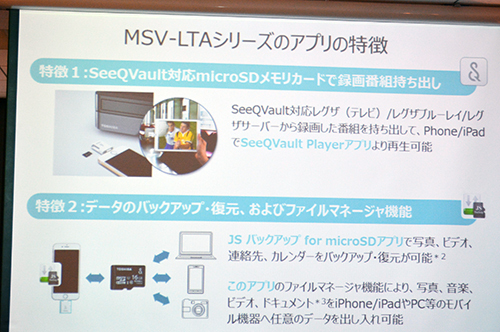 「MSV-LTAシリーズ」は、付属のLightningコネクタ対応microSDカードリーダーでiPhoneやiPadに接続すれば、SeeQVault対応のレコーダーなどで録画した番組を無料アプリ「SeeQVault Player」で再生できる。オフラインでも視聴可能で、カードリーダーを差し替えれば、ほかのiPhoneやiPadでも利用できる。