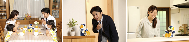 従来モデル「Robi jr.」と同様に、「ロビ」の幼少期をイメージし、話す相手の方向を感知して顔を向けたり、傾げたり、手足を動かしたりして会話をする。