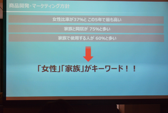 その上で、レコーダーのユーザーを対象としたアンケート調査の結果を紹介。女性の比率が37%とここ5年で最も高く、家族と使用する人が60%だったと説明し、「女性」と「家族」をマーケティングのキーワードに設定したと紹介した。