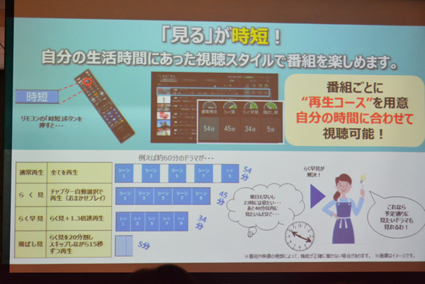 「見る」機能に関しては、録画した番組を自分の時間に合わせて視聴できる、「通常再生」「らく見」「らく早見」「飛ばし見」の4種類の再生コースを用意した。「らく見」「らく早見」コースでは、番組の内容を省略することなく、「時短」で視聴可能。また、コースごとに視聴にかかる時間が表示され、空き時間を有効活用しながら録画した番組を楽しめる。