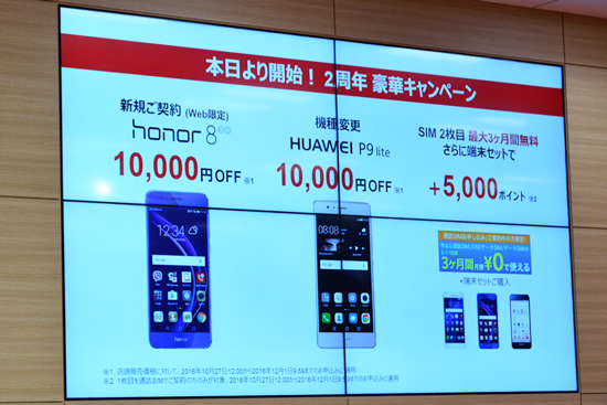 12月1日までに「honor 8」を「楽天モバイル」のウェブサイトから購入したユーザーを対象に、税別4万2800円のところ1万円引きの3万2800円で販売する。