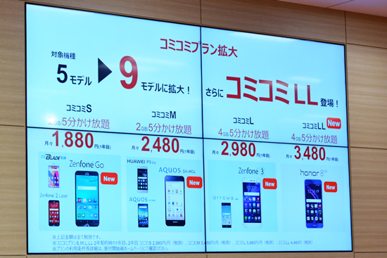 このほか、端末料金と通信、通話がセットになった「コミコミプラン」の対象端末を拡充する。端末料金と2GBの高速データ、5分かけ放題がセットで税別月額1880円のプランSの対象端末に「ZenFone Go」を追加するほか、端末料金と4GBの高速データ、5分かけ放題がセットで税別月額2980円プランLの対象端末に「ZenFone 3」を追加する。
