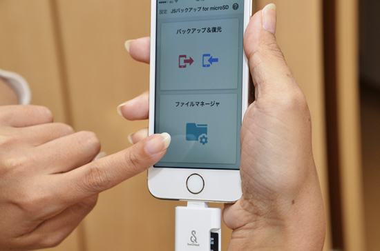 カードリーダに対応microSDメモリカードを差し込み、iPhoneに接続する。「JSバックアップ for microSD」を起動すると、「バックアップ&復元」か「ファイルマネージャ」のどちらかを選ぶ画面が表示された。アプリインストール後は、オフラインで作業ができるので、インターネット環境は不要だ。