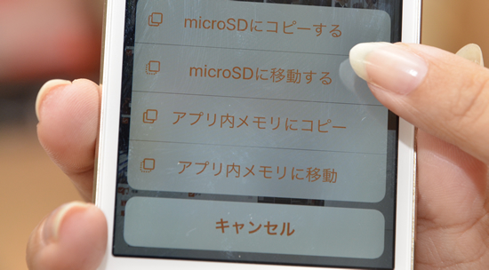 表示はシンプルで大きいので、誰でも迷わずに使える感じだ。今回は、写真を移動させたいので「ファイルマネージャ」をチョイス。700枚近い写真を全選択し、「microSDに移動する」を選んで移行を開始した。