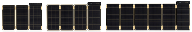 パネルは1枚あたり2.5Wで、最大6枚(計15W)まで追加が可能。パネル1枚の厚さは最薄部で2mmと極薄なので、手軽に持ち運べる。生活防水仕様で、リアルタイムの電流量がわかるデジタル電流計を備える。