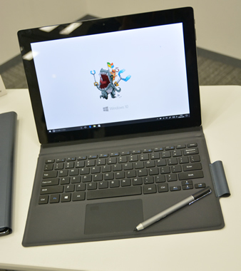 解像度1920×1200ドットのアクティブペン対応12.2インチ液晶ディスプレイを搭載。タブレットスタイルでも、カバー一体型キーボードを装着して、ノートPCスタイルでも利用できる。OSはWindows 10 Home 64bit版で、Windows 10 Anniversary Updateで実装された、専用ペンで手書きできる「Windows Ink」に対応し、デスクトップ画面に直接書き込むことでより気軽に、直感的に使用できる。