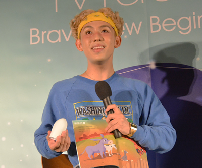 蔦屋家電で25日に開いた発表会には、タレントのりゅうちぇるさんが登場。専用の教材を使って英語学習を体験し、「楽しみながら勉強できる。すごくほしい」と感想を語った。