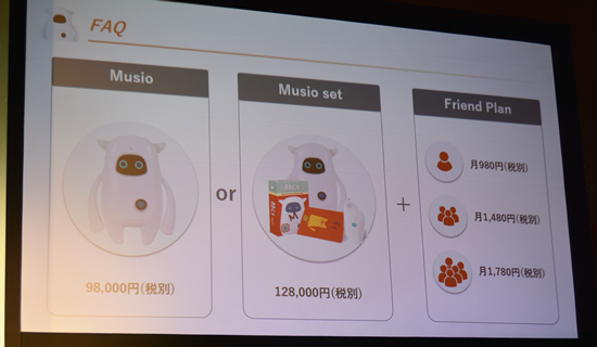Musioは、思考や視覚、聴覚、感情表現の各能力を持つのが特徴で、友人と会話をするようにして英語を学ぶことができる。サイズは、幅168mm×高さ220mm×奥行き85mm。重さは850g。バッテリの駆動時間は約10時間。本体の価格は税別9万8000円。