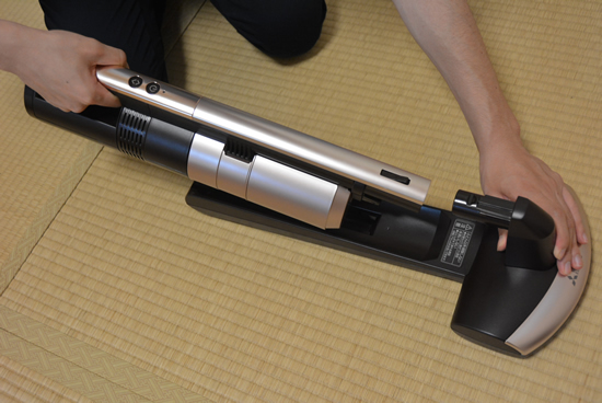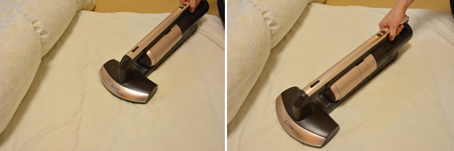 コードレススティッククリーナーの「iNSTICK(HC-VXF30P)」には、ふとん掃除専用の「アレルパンチふとんクリーンアタッチメント」が付属する。アタッチメントは結構な大きさだが、大型車輪がついている。本体に装着してスイッチを入れると、ふとんの上を滑らせるように動かすことができるので、手にかかる負担は少なく、女性でも楽に操作できそうだ。コードレスだから、ふとんの上でコードが邪魔にならず、小回りが効いて使いやすい。また、アタッチメントの底面部には「アレルパンチ植毛」がついているので、ダニの死がいやふんなどのアレル物質を抑制してくれるのもうれしい。