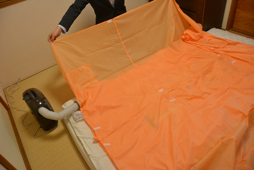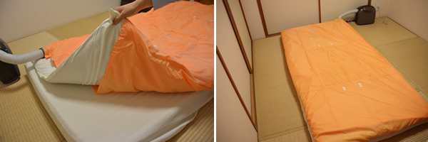いったん、乾燥させたいふとんの上にマットを敷いた後、マット左右をもう一段階広げて、ふとんを包み込む。ふとんを包んで、温風をふとんの隅から中綿まで、しっかり行き届かせられるので、ダニを徹底的に退治することができる。