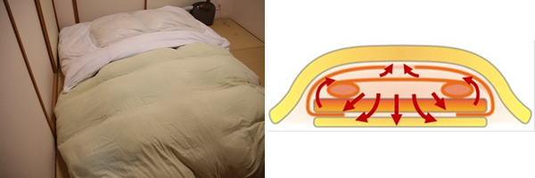 乾燥開始後、間もなく掛けふとんが膨らんだ。右はふとん内部の断面図。効率的に熱が伝わっているのが分かる