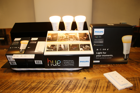 「スターターセット」は、ランプ2個に加え、Dimmerスイッチ、ブリッジが付属する。シングルランプとDimmerスイッチは単体でも発売する。