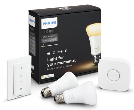 「スターターセット」のシングルランプとDimmer スイッチは同期済みなので、ソケットにランプを差し込むだけで使用可能。Dimmerスイッチによって最大10個のランプのオン/オフ操作ができ、4つのライトレシピの選択と調光に対応する。さらに、ブリッジと接続すれば、専用アプリを利用して5つのシーンを設定できる。