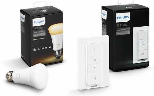 Philips Hue ホワイトグラデーション シングルランプ(左)とDimmerスイッチ