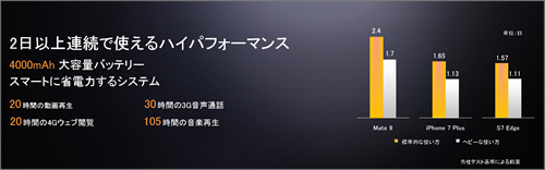 まずは、注目度No.1のスマホから。「HUAWEI Mate 9」は、CPUに、パフォーマンスと電力効率がアップした最新の「Kirin960」を採用し、64GBのストレージ、2日以上連続で使える4000mAhの大容量バッテリを搭載したハイスペックモデルだ。わずか20分の充電で、1日フルに使える急速充電にも対応する。