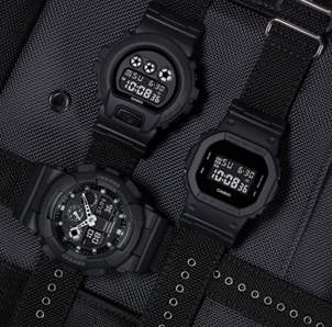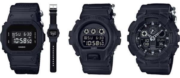 ベースモデルには、Gの遺伝子を色濃く受け継ぐ「DW-5600」、多くのコラボレーションモデルにも採用される「DW-6900」、迫力のビッグケースでJIS1種耐磁性能を備える「GA-100」を採用。「ミリタリーブラック」は、いずれもオールブラックのワントーンで、精悍で力強さを感じさせるミリタリーデザインに仕上げた。
