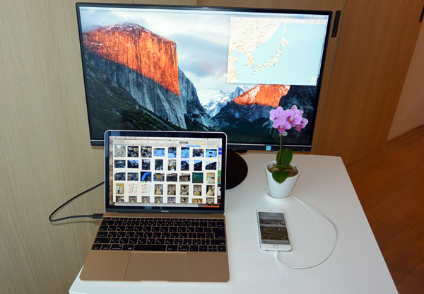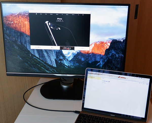使い勝手を確認するために実際に接続してみた。テーブルの奥にディスプレイを設置し、その手前にMacBookを置いて、ディスプレイ付属のUSB Type-C-Cケーブルでつなぐ。ディスプレイには、別途、電源ケーブルを接続し、MacBookにはディスプレイ経由で給電(充電)する。