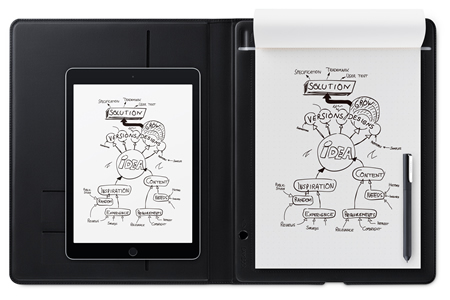 デジタル化したメモは、ワコムが提供するInkspaceをはじめ、Dropbox、Evernote、OneNoteといったクラウドサービスで保存・整理が可能なほか、本体に約100ページ分のデータを保存できる。コンパクトなスモールサイズで、付属のカバーは、ノートに書いたメモを隠せるほか、名刺や書類を収納可能なポケット付き。価格は未定。