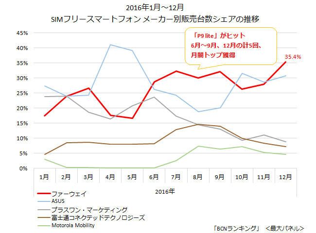 2016年のSIMフリースマホ販売台数1位はファーウェイの「HUAWEI P9 lite」だった。「P9 lite」は6月の発売直後から人気を集め、ロングセラーに。ファーウェイが4か月連続でメーカー別シェアトップを獲得する原動力になった。12月には、直近1年間で最大の35.4%のシェアを獲得。年末商戦を制し、ますます勢いに弾みがついた印象だ。